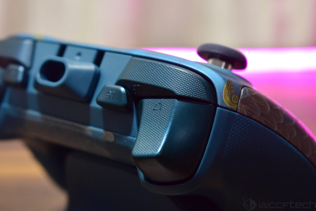 O controle também oferece conectividade versátil e funcional, com dois botões traseiros programáveis (que podem ser bloqueados) e uma entrada de áudio de 3,5 mm.