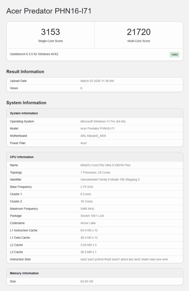 Nos testes vazados, o Core Ultra 9 290HX Plus alcançou 3.153 pontos em single-core e 21.720 pontos em multi-core. Quando comparado diretamente ao Core Ultra 9 285HX, o novo componente apresenta uma evolução incremental, porém sólida, especialmente considerando que não houve aumento na contagem de núcleos.