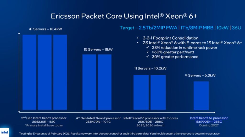 Em colaboração com a Ericsson, a Intel demonstrou o salto geracional da família Clearwater Forest (Xeon 6+), prevista para lançamento em 2027. Os testes compararam um único chip da nova geração contra uma configuração de dois soquetes da geração anterior.